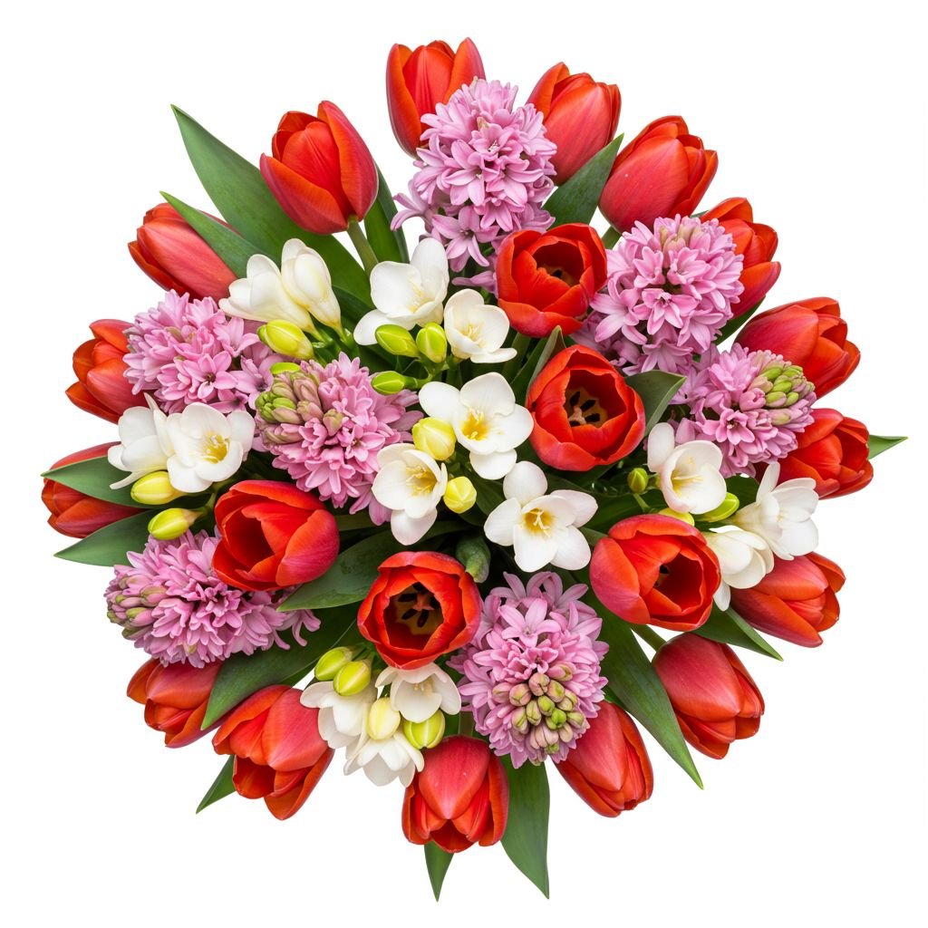 - Tulips (color of your choice): symbolizing love and springtime renewal, add a burst of color and charm to the arrangement.