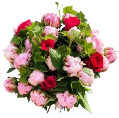 - Cerise Roses: adding a vibrant contrast to the pink peonies, our cerise roses are rich in color and full of charm. The deep, bright cerise hue symbolizes passion, energy, and admiration. These roses bring a bold and striking element to the bouquet, ensuring it stands out and makes a memorable impact.