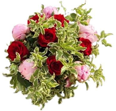 The combination of pink peonies, red roses, and pittosporum foliage creates a stunning bouquet that is both romantic and visually captivating. Whether as a gift for a loved one or as a centerpiece for a special occasion, this bouquet is sure to evoke feelings of love and admiration. Experience the magic of romance with our Enchanting Bouquet of Pink Peonies and Red Roses, a stunning blend of two timeless blooms that symbolize love and passion. Handcrafted with care, this bouquet features delicate pink peonies intertwined with vibrant red roses, creating a captivating display of color and fragrance.