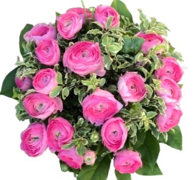 A Bouquet of Pink Ranunculus with Pittosporum is a lovely and elegant floral arrangement. Pink ranunculus are beautiful, delicate flowers that add a touch of romance and charm to any bouquet. They are known for their intricate, layered petals and vibrant pink color, making them a popular choice for weddings, special occasions, or simply to brighten up a room.