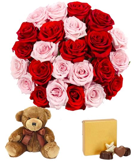 Express your love and affection with this charming Bouquet of Red and Pink Roses, paired with delightful chocolates and a cuddly teddy bear. This thoughtful gift set combines the timeless elegance of fresh roses with the sweetness of premium chocolates and the comfort of a soft plush toy, making it perfect for romantic occasions, anniversaries, or simply to make someone smile.