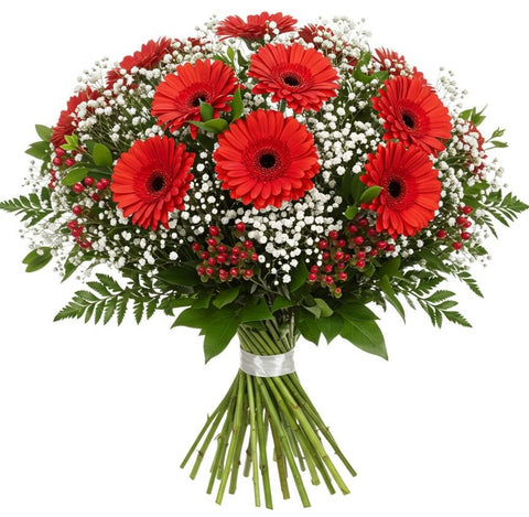 Shop the Bouquet of Red Gerberas with Gypsophila and Hypericum at Flowers Box London. Enjoy nationwide delivery with same-day options available in London. This eye-catching bouquet combines bold red gerberas, delicate gypsophila, and vibrant hypericum berries —i deal for birthdays, anniversaries, or heartfelt surprises. Order now from the best online flower shop and send a striking floral arrangement today!