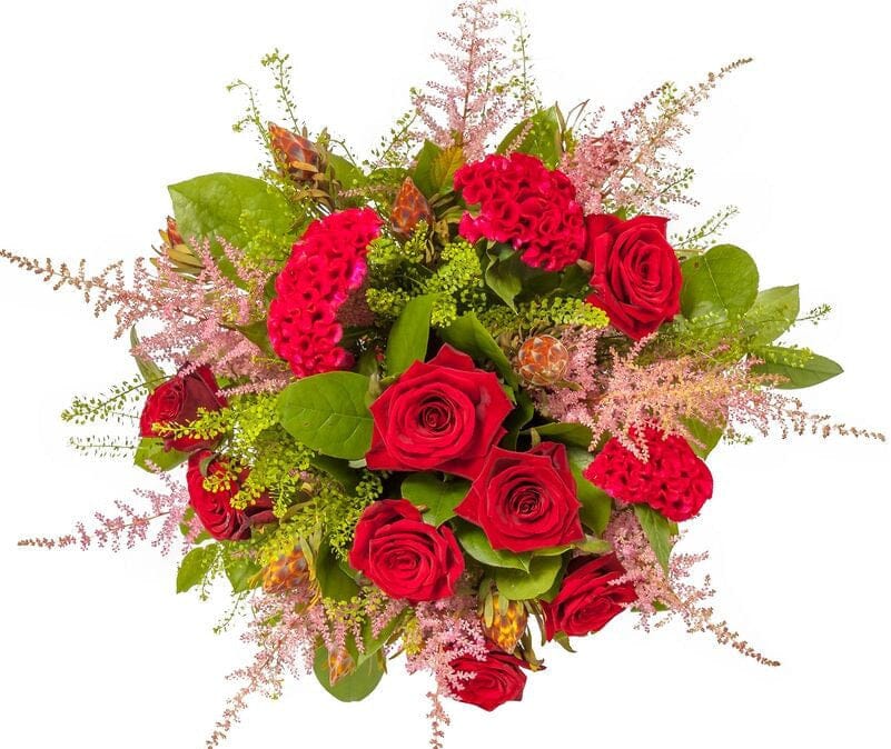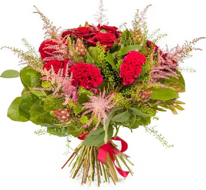 Order the Bouquet of Red Roses with Celosia from Flowers Box London. A vibrant mix of romantic red roses and textured celosia, perfect for love, anniversaries, or heartfelt gifts. Fast and secure UK delivery. Order your Bouquet of Red Roses with Celosia today and send a powerful message of love, passion, and sophistication — delivered fresh and flawlessly arranged across the UK.
