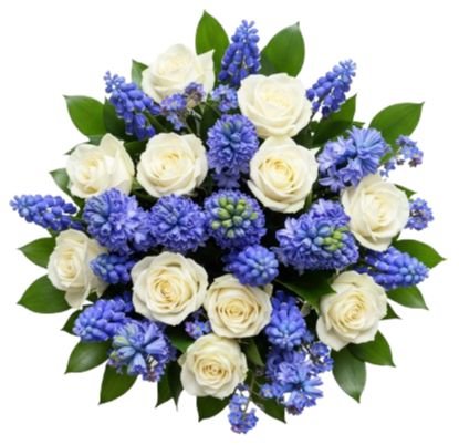 Delicate, romantic, and deeply meaningful – our Bouquet of Roses and Hyacinth with Blue Forget-Me-Not is a floral arrangement designed to captivate. Featuring a soft blend of blue hyacinths, white roses, and blue forget-me-nots, this bouquet symbolizes sincerity, remembrance, and pure love. The blue hyacinths bring a graceful elegance and calming fragrance, while the white roses represent purity, grace, and heartfelt emotion.