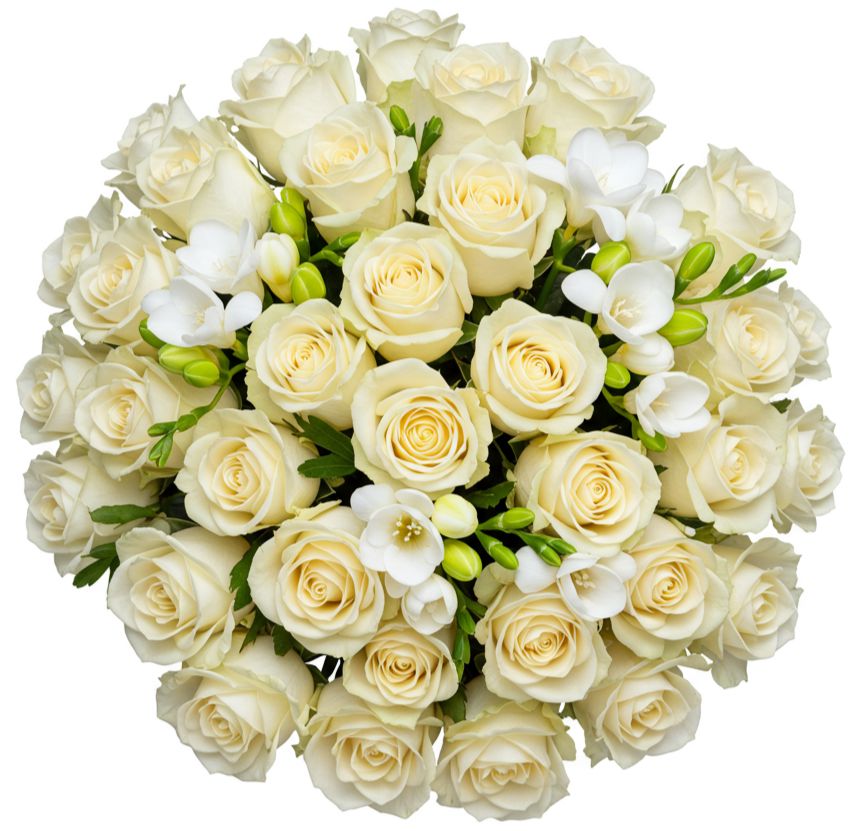 - White Freesias: known for their delicate beauty and captivating fragrance, white freesias symbolize innocence, thoughtfulness, and trust. Their soft petals and sweet scent add a fresh, uplifting note to the arrangement.