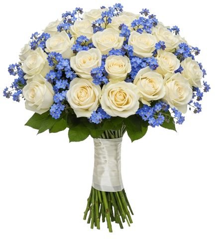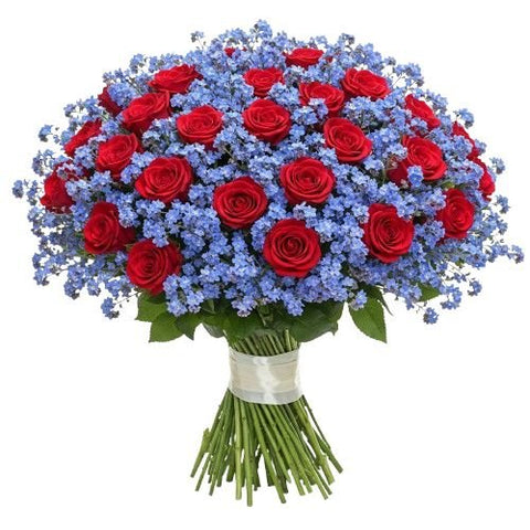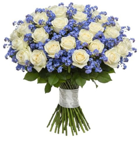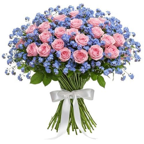 The roses and forget-me-nots harmonize in a symphony of colors and textures, creating a bouquet that is both enchanting and unforgettable. Whether as a gift to celebrate a special occasion or to express heartfelt sentiments, this bouquet is sure to leave a lasting impression and evoke joy in its recipient.