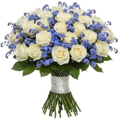 - Blue Forget-me-nots: are small, dainty flowers with delicate blue blooms. They symbolize true love, loyalty, and fond memories. The addition of blue forget-me-nots introduces a subtle pop of color to the bouquet, creating visual interest and depth.