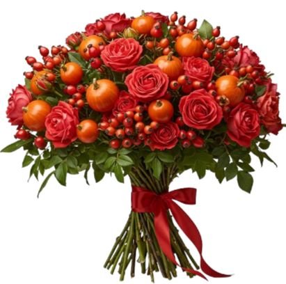 - Red Rose Hip Berries: glossy and vibrant, red rose hips introduce texture and seasonal charm to the bouquet. Their berry-like clusters enhance the autumnal theme while adding depth and contrast to the arrangement.
