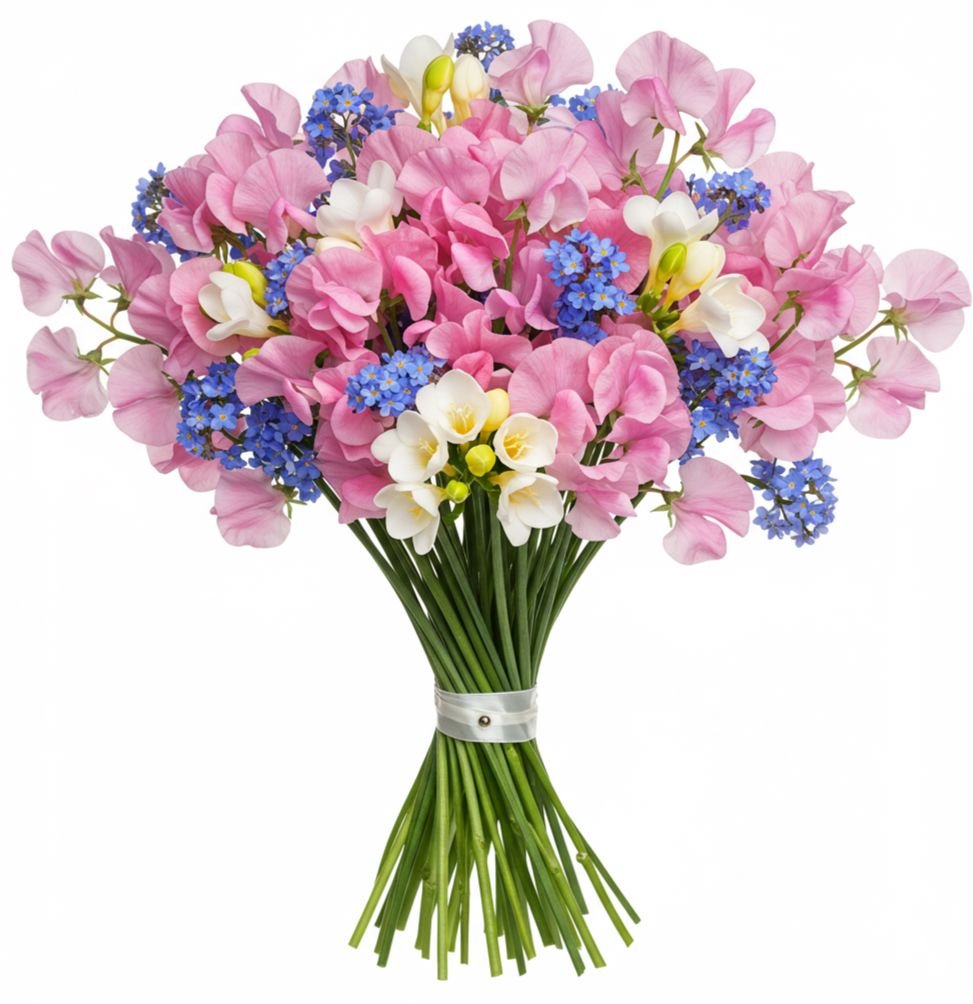 Delight in the delicate charm of our Bouquet of Sweet Pea and Freesias with Blue Forget Me Not, a beautifully curated floral arrangement that combines elegance, fragrance, and vibrant color. This enchanting bouquet features your choice of sweet pea blooms in a variety of colors, paired with pure white freesias and the soft, tranquil tones of blue forget me not flowers.
