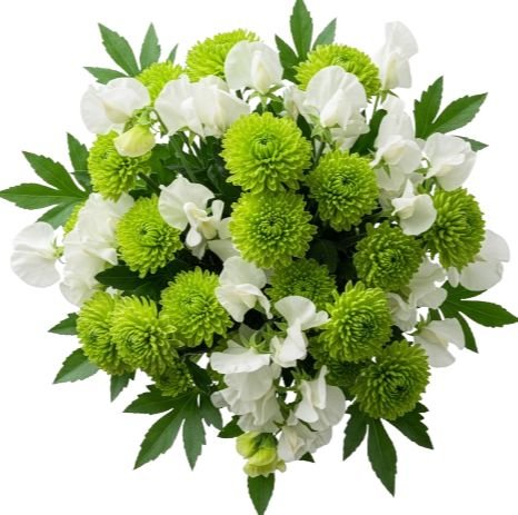 Bring freshness, charm, and natural beauty into any space with our Bouquet of Sweet Pea and Green Santini Chrysanthemum. This unique floral arrangement combines the soft elegance of Sweet Peas (available in white or a color of your choice), the vivid green tones of Santini Chrysanthemums, and carefully chosen seasonal greenery to create a bouquet full of balance and vibrancy. Perfect for birthdays, sympathy, or simply to brighten someone’s day, this bouquet is a thoughtful gift that captures the essence of freshness and joy. Surprise your loved ones with the timeless beauty of our Bouquet of Sweet Pea and Green Santini Chrysanthemum — a floral symphony that combines delicacy, freshness, and elegance.