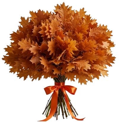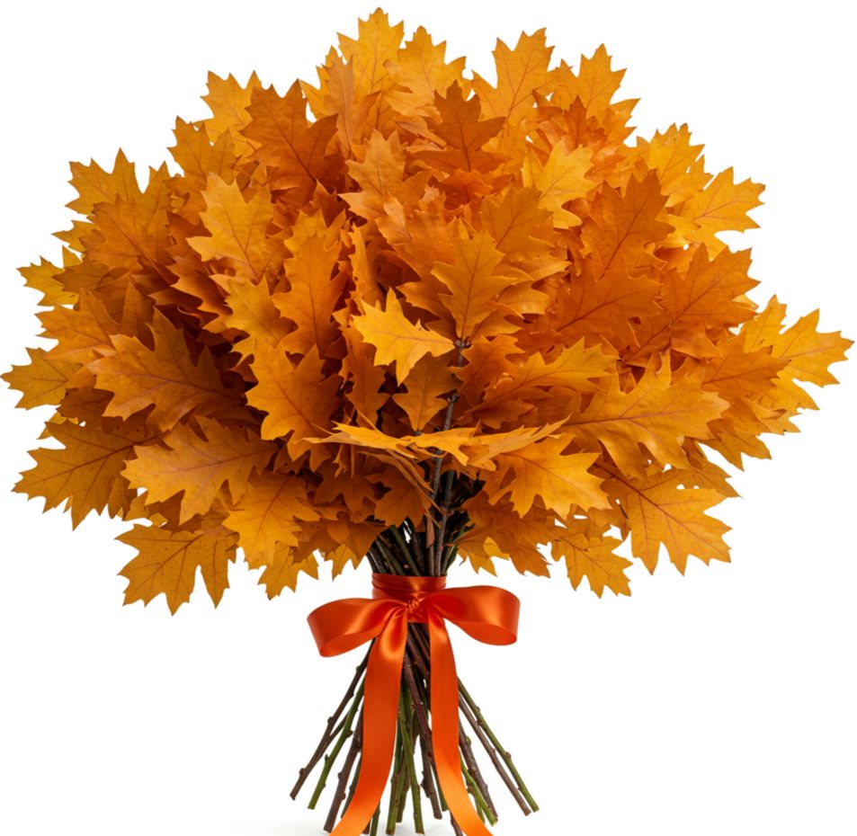 - Orange Oak Leaves: with their rich hues of burnt orange, copper, and amber, oak leaves are a classic symbol of strength, endurance, and the cycles of life. Their warm tones embody the beauty of fall foliage, making this bouquet a perfect seasonal accent. The crisp, textured leaves add depth and movement, creating a natural and earthy aesthetic.