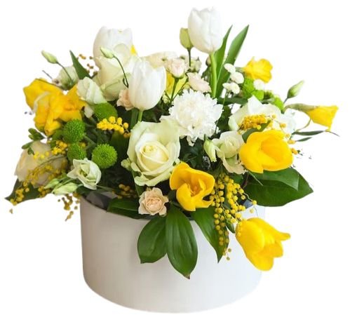 Bring the freshness of spring into your home or surprise a loved one with the Box of White and Yellow Spring Flowers. Order now for a cheerful, elegant floral experience!