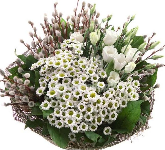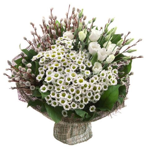 Flowers Box London offers a special arrangement for Easter in the form of a bright white bouquet. The cat's bases give the whole composition a Christmas atmosphere and look beautiful with white, small chrysanthemum and white eustoma.