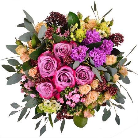 Featuring a stunning mix of peach spray roses, pink bouvardia, cerise roses, red skimia, pink hyacinth flowers, white ornithogalum, and populus, this floral box is designed to impress. The vibrant combination of pink, peach, and red blooms creates a sophisticated yet passionate statement.