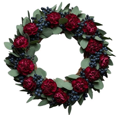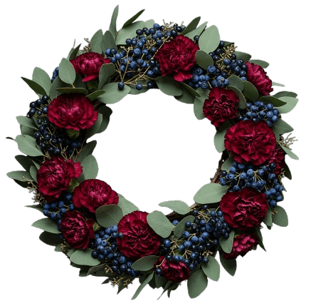 Welcome guests in style with our Burgundy Carnations with Blueberries Door Wreath – a stunning combination of soft carnations, rich viburnum blueberries, and aromatic eucalyptus. This handcrafted wreath brings a perfect balance of elegance, color, and freshness to your home decor. The delicate blooms of carnations symbolize love and admiration, while the deep tones of viburnum blueberries add a unique seasonal touch. Accented with fresh eucalyptus for a soothing scent, this wreath creates a warm and inviting atmosphere — ideal for any door, wall, or seasonal celebration.