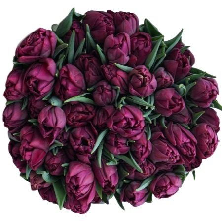 The bold burgundy hue adds a sense of drama and passion, making this bouquet ideal for romantic occasions, anniversaries, or as a thoughtful gift to express admiration and deep affection. The Burgundy Double Tulips Bouquet are carefully arranged to highlight their lush, rich color and exquisite form, creating an eye-catching and elegant display.