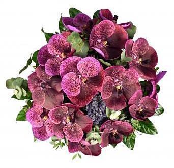 - Greenery: carefully selected foliage adds volume and freshness, balancing the deep hues of the orchids and lavender while enhancing the overall structure of the bouquet.