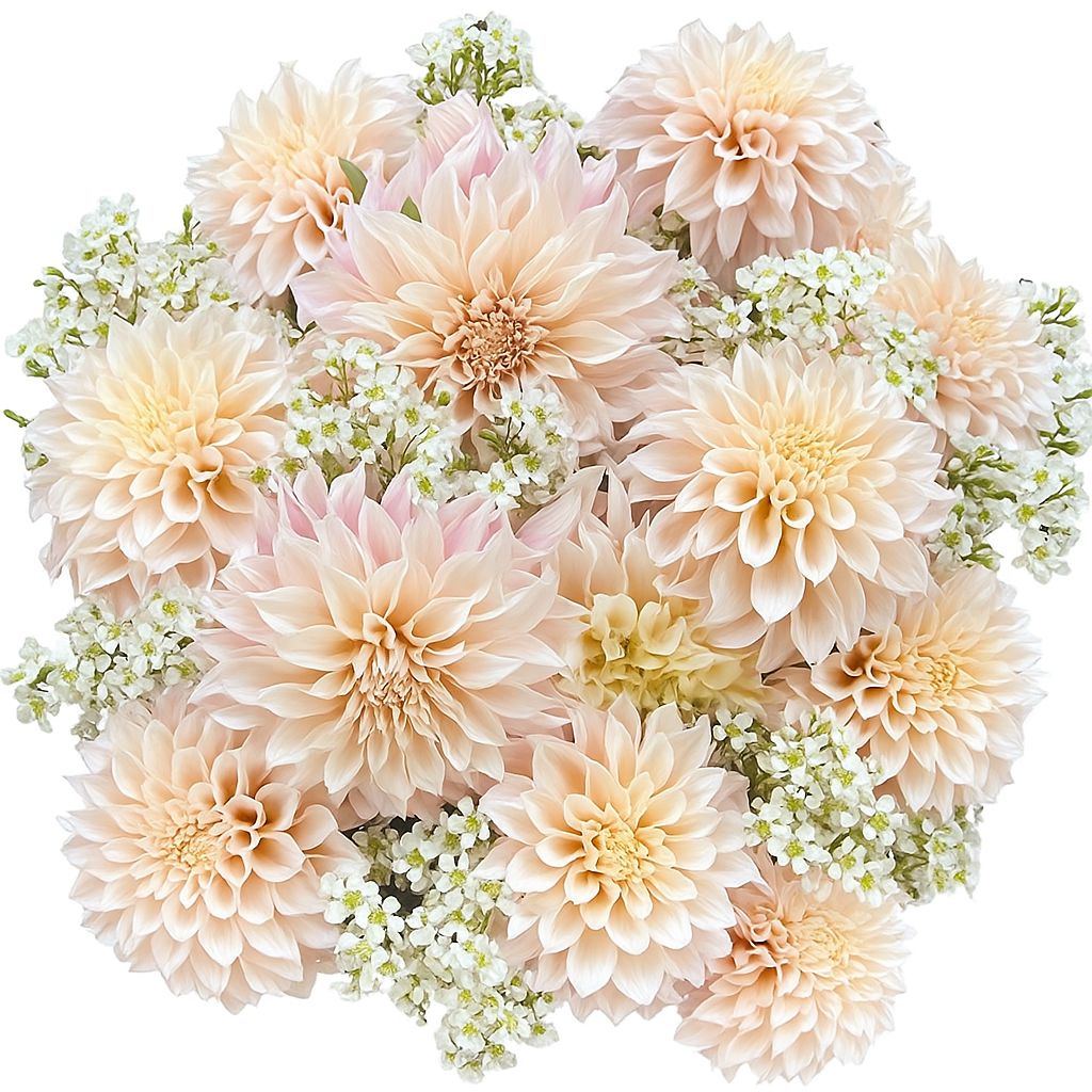 The soft, pastel shades of the dahlias, paired with the subtle elegance of the wax flowers, create a harmonious and timeless bouquet that is perfect for any occasion. Whether you're celebrating a special event, birthday, expressing gratitude, or simply want to add a touch of beauty to your home, the Cafe au Lait Dahlia Bouquet with Wax Flowers is the ideal choice.