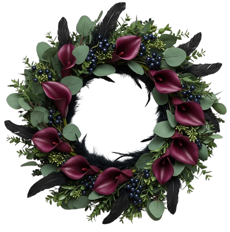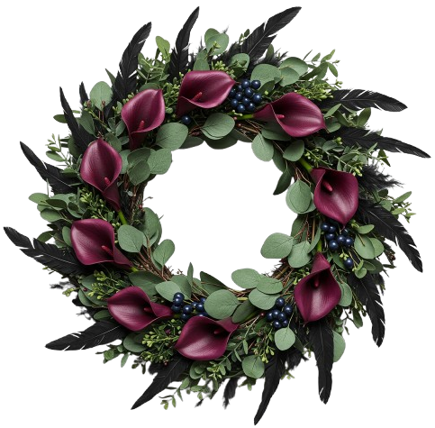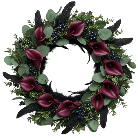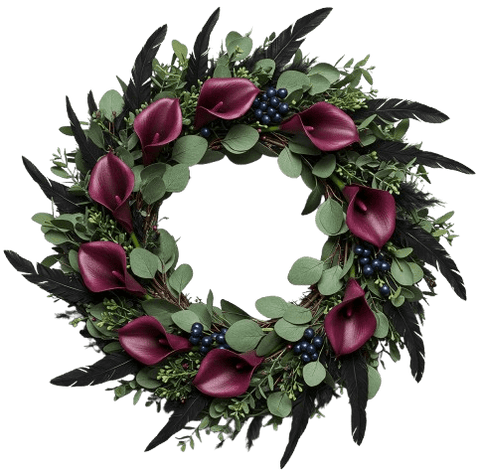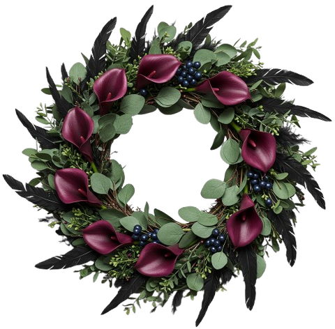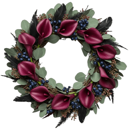 - Burgundy Calla Lily: elegant and bold, these deep red blooms add a touch of luxury and drama to the wreath.