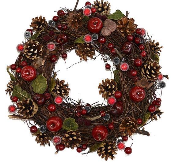 Introducing the Candy Festive Christmas Wreath, a delightful and vibrant holiday decoration that will fill your home with festive cheer. This wreath features a perfect blend of natural and artificial elements, creating a joyful and eye-catching piece that embodies the spirit of Christmas. The wreath is adorned with natural cones, adding a rustic touch and a sense of nature to your seasonal decor. Red artificial apples bring a pop of bright color, reminiscent of holiday treats and traditions, while red artificial berries add a festive sparkle, capturing the essence of a winter wonderland.