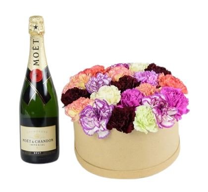Discover the perfect gift with our Carnations Box and Champagne Gift Set from Flowers Box London. Featuring a vibrant box of carnations paired with premium champagne, this gift set is ideal for celebrating any occasion.