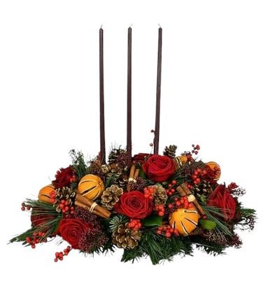 This Centerpiece of Red Roses and Dried Orange Fruits is a perfect blend of elegance and rustic charm, ideal for holiday gatherings. Its rich colors, fragrant elements, and warm candlelight create a cozy yet sophisticated ambiance, making it an unforgettable addition to any holiday table or winter celebration.
