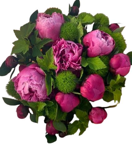 Crafted with precision and artistry by our skilled florists, this exquisite bouquet is a testament to the beauty of diversity and harmony. Whether it's a gesture of love, celebration, or gratitude, our Cerise Peony and Green Trick Carnation Bouquet is sure to leave a lasting impression and evoke joy in the heart of the recipient.