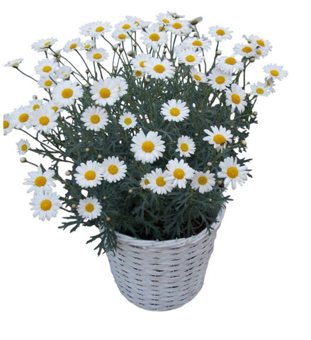 Brighten someone’s day with the joyful charm of this delightful flowering plant, beautifully arranged in a rustic basket. With its dainty white petals and sunny yellow centers, the Marguerite Daisy brings a fresh, cheerful touch to any space. Ideal for birthdays, housewarmings, or simply to say "I'm thinking of you," this long-lasting gift is sure to make a lasting impression.