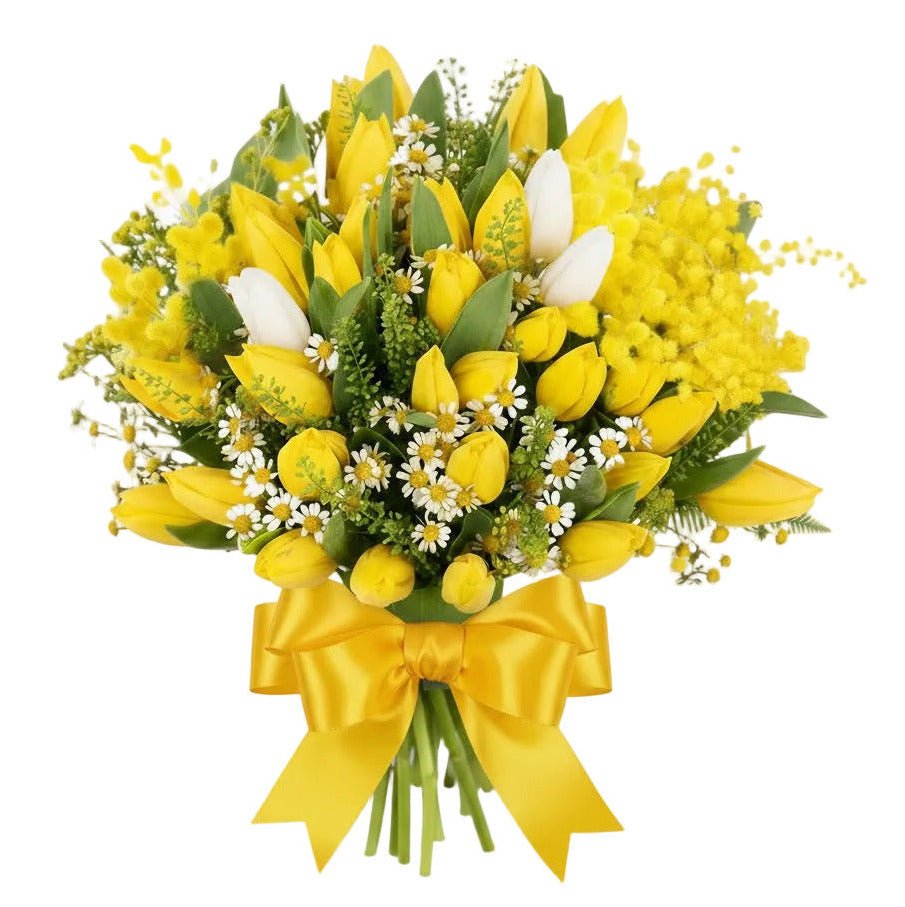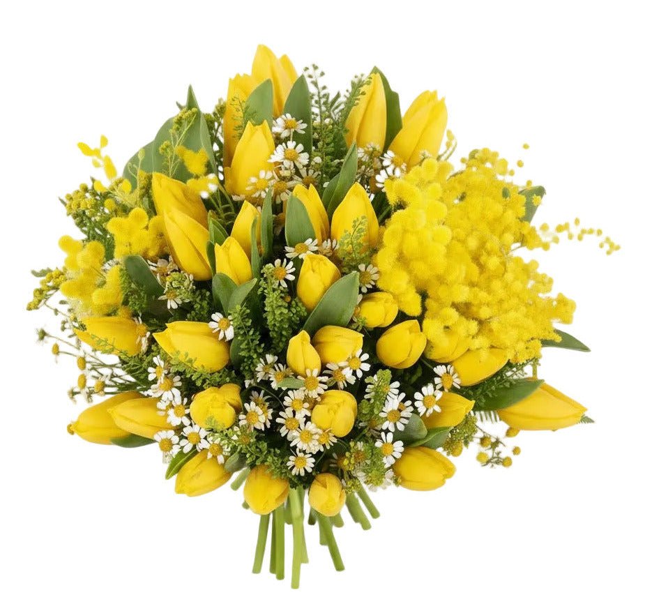 - Tulips (color to choose from): elegant, smooth-petalled blooms available in a variety of shades to suit your preference. Tulips add graceful lines and a modern touch, while their clean shape creates a beautiful contrast against the soft texture of mimosa. They symbolise love, renewal, and seasonal freshness.