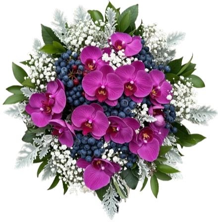 Discover the sophistication of our Charming Bouquet of Phalaenopsis Orchids with Gypsophila and Berries, a floral masterpiece designed to captivate with elegance and timeless beauty. This exquisite arrangement brings together the luxurious charm of Phalaenopsis Orchids (available in the color of your choice), the delicate softness of white gypsophila, the unique texture of viburnum blueberries, and lush seasonal greenery to complete the look.