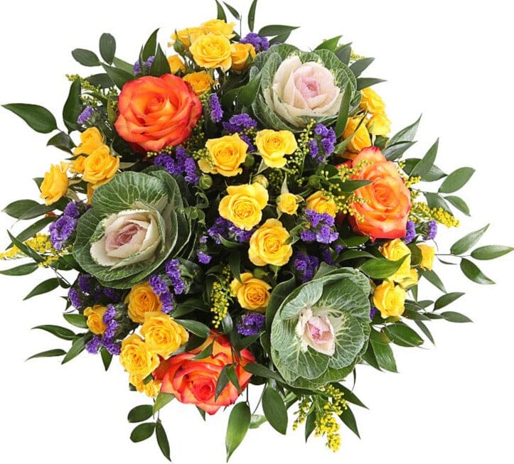 Charming Bouquet of Spray Roses and Brassica – A Burst of Color and Elegance