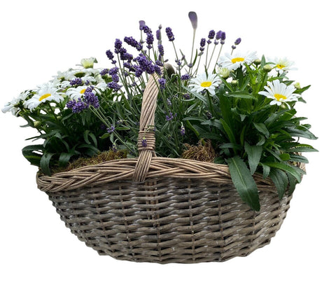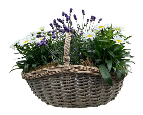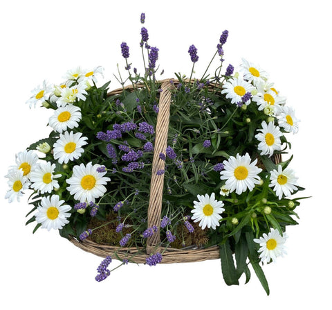 A delightful gift or seasonal display piece, this basket is available for delivery across the UK. Add a touch of charm and tranquility to any setting with this timeless floral pairing. Order now and share the calming beauty and fresh appeal of this delightful Lavendula and Daisy Leucanthemum basket!