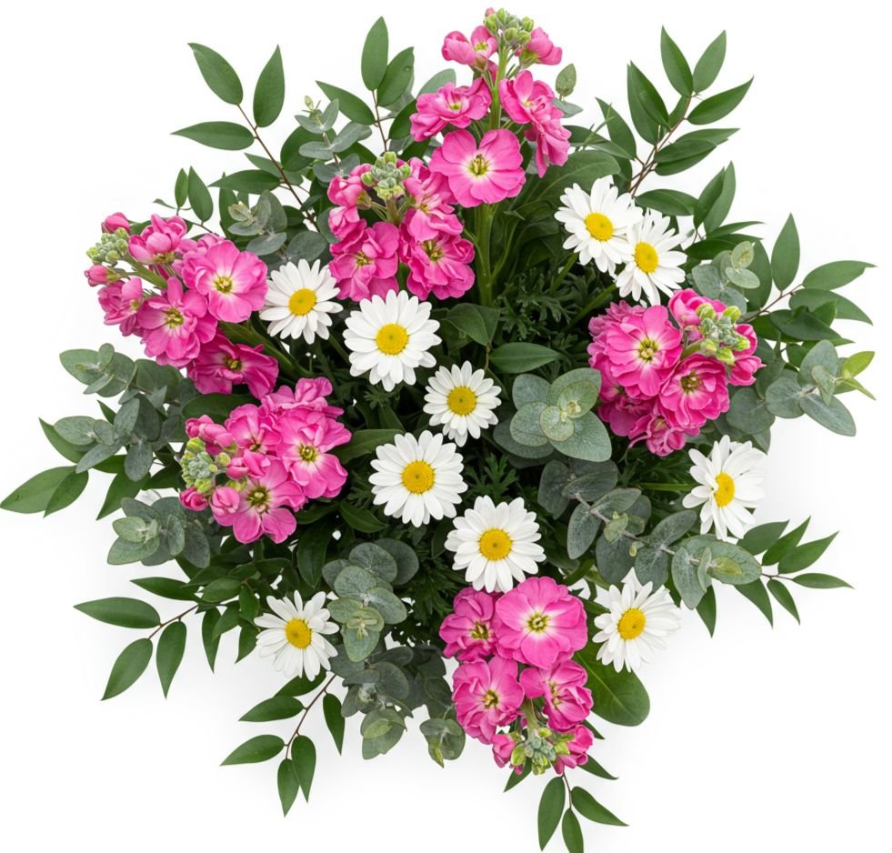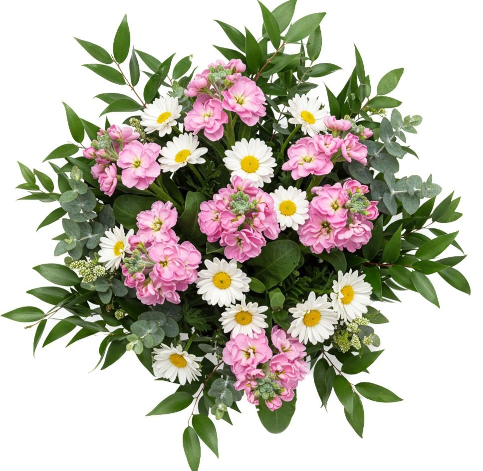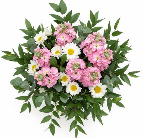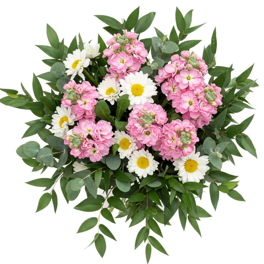 Add a fresh and elegant touch to any occasion with our Charming Stock with Daisy Leucanthemum Bouquet. This delightful arrangement blends soft, delicate blooms with aromatic greenery, perfect for brightening up your home or gifting to someone special. Choose your stock colour to personalize this bouquet and enjoy a fresh, vibrant floral arrangement delivered right to your door. Brighten your living space or dining table with this elegant and fragrant bouquet.
