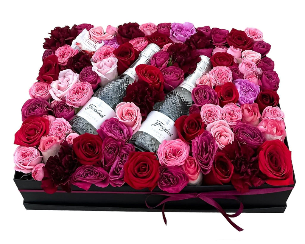 Our Cheers to Elegance: Alcohol in Blooms Gift Box combines the timeless beauty of flowers with the indulgence of a premium bottle of alcohol, creating an extraordinary gift for any celebration. Featuring a stunning mix of red, pink, and burgundy blooms, this gift box is perfect for those who appreciate both the beauty of nature and the pleasure of fine spirits.