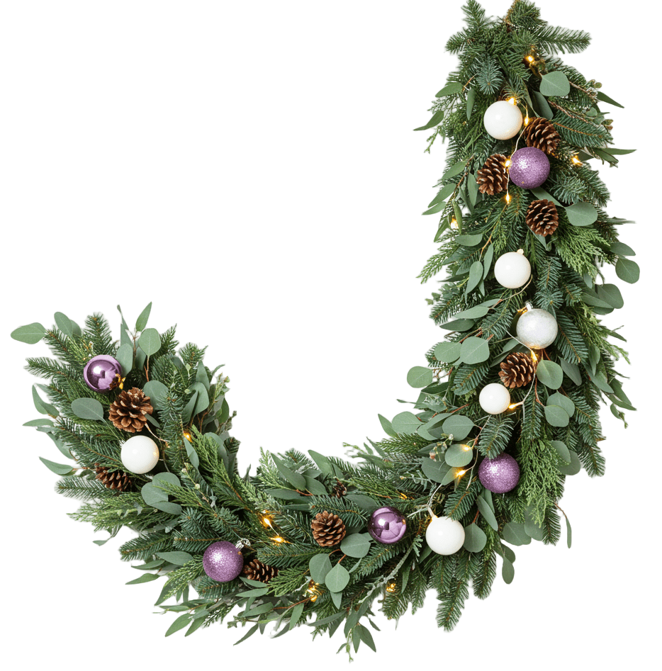 Bring modern elegance to your holiday décor with our Chic Winter Garland in White & Violet Tones, a stunning combination of purple baubles, white baubles, natural white cones, and lush fresh spruce and conifer greenery. Accented with Populus foliage and soft warm lights, this garland creates a sophisticated and festive atmosphere perfect for the winter season. Ideal for mantels, staircases, door frames, or Christmas table décor, this luxurious garland blends contemporary colours with natural textures to elevate your home’s festive look. Each piece is handcrafted with attention to detail to ensure long-lasting freshness and beauty throughout the holidays.