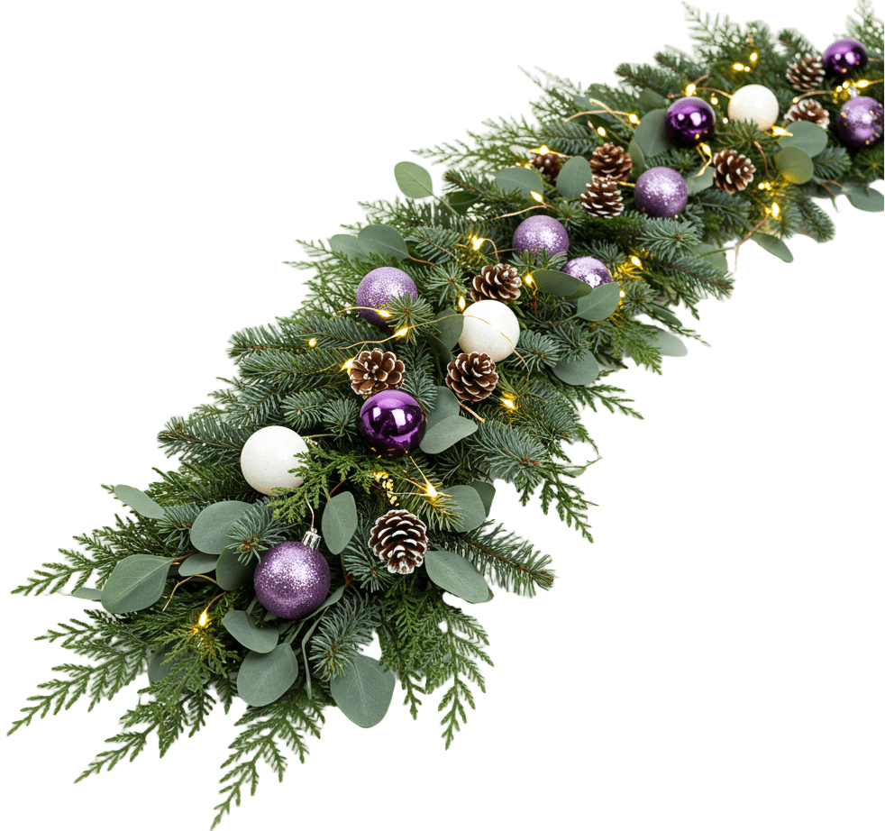 - Purple Baubles: elegant ornaments symbolizing creativity, luxury, and festive charm.