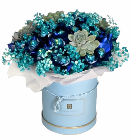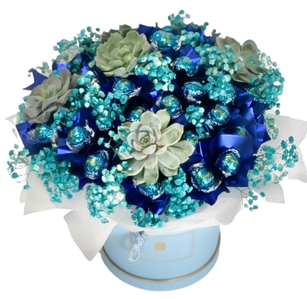 *The photo shows only an example of this box arrangement - Blue Lindt + Succulents + Blue Gypsophila. Of course, when you choose the chocolates and size, it looks a bit different.