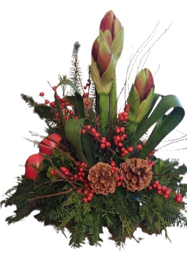 - Red Amaryllis: are the centerpiece's focal point, bringing dramatic beauty and elegance. Their large, trumpet-shaped flowers symbolize determination and splendid beauty, making them a perfect choice for holiday decorations. The rich red color evokes feelings of warmth and festivity, instantly transforming any space.