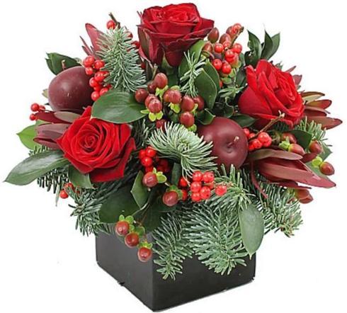 - Red Roses: add a classic, romantic touch to the arrangement. Their velvety petals bring depth and elegance, perfectly complementing the festive theme.