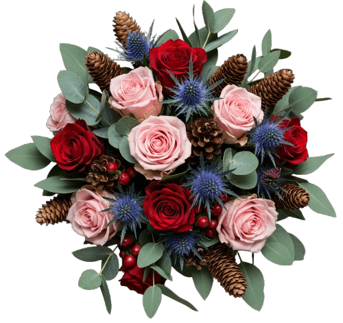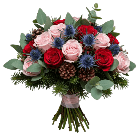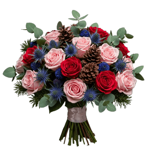 Bring warmth and elegance to the holiday season with our Christmas Cheer Bouquet, a stunning arrangement that captures the magic of Christmas in every bloom. Featuring a festive mix of pink roses, red roses, blue eryngium, natural cones, and aromatic eucalyptus, this bouquet blends classic beauty with wintery charm for a truly memorable gift or centerpiece. The soft Pink Roses add a touch of romance, while the red roses bring rich festive color. blue eryngium introduces texture and a wintry hue reminiscent of frosty mornings, complemented by natural cones and eucalyptus for a rustic, woodland-inspired finish. Together, these elements create a bouquet that’s both sophisticated and full of Christmas spirit. Celebrate the season with the Christmas Cheer Bouquet, a luxurious and thoughtfully crafted floral design that brings joy, color, and elegance to every festive occasion.