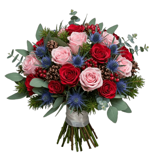 Christmas Cheer Bouquet – A Festive Blend of Roses, Eryngium & Seasonal Charm