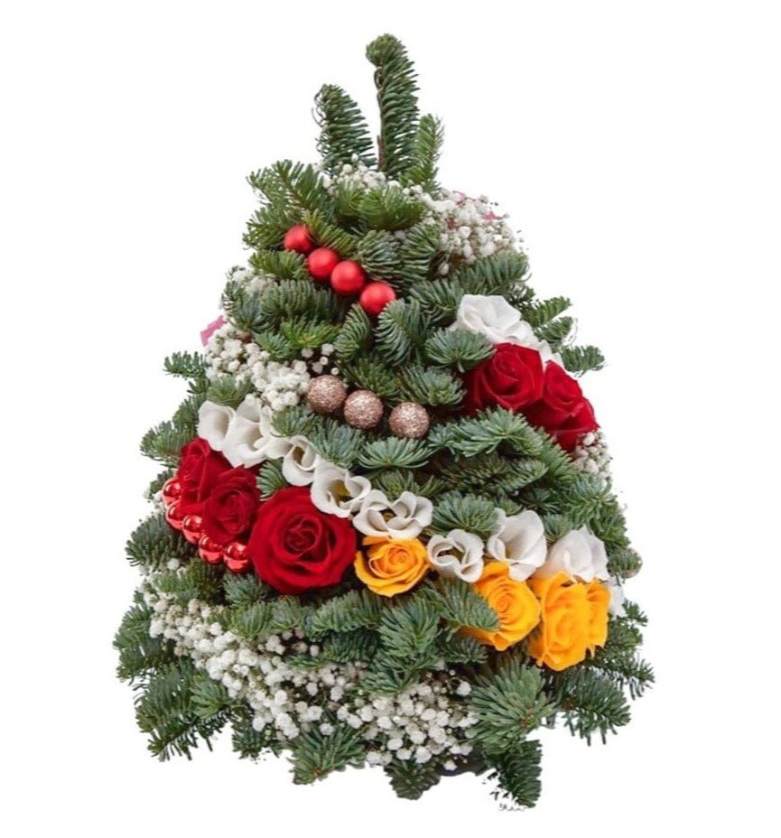 This arrangement brings the spirit of the season to life with seasonal flowers and holiday greenery, arranged to mimic the shape and beauty of a Christmas Tree.