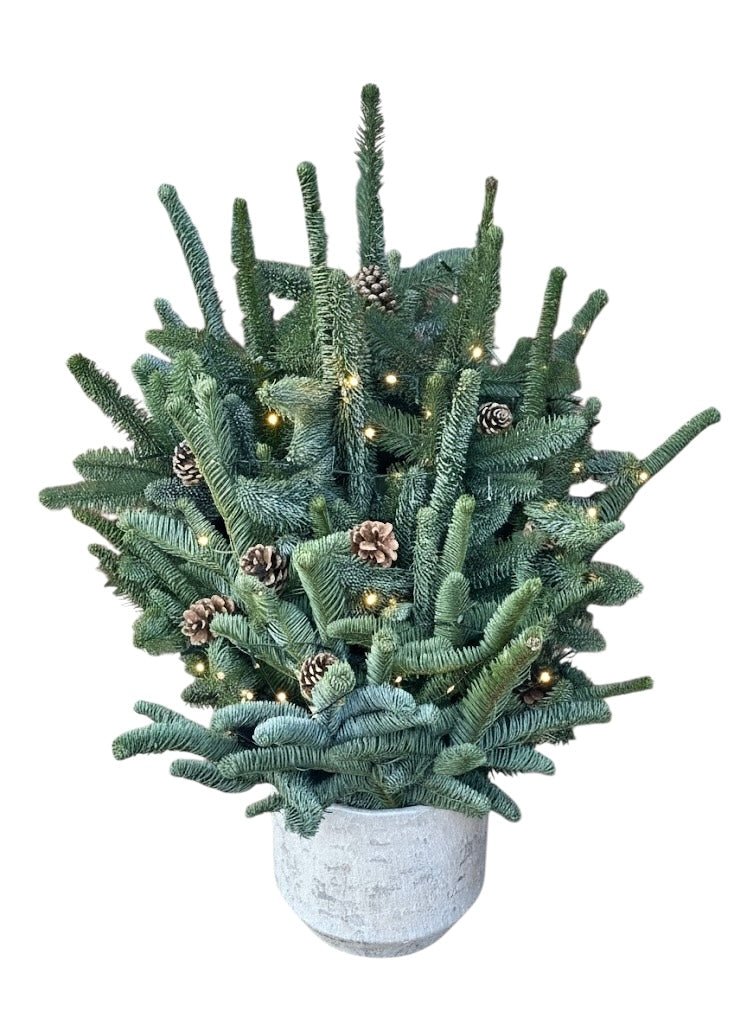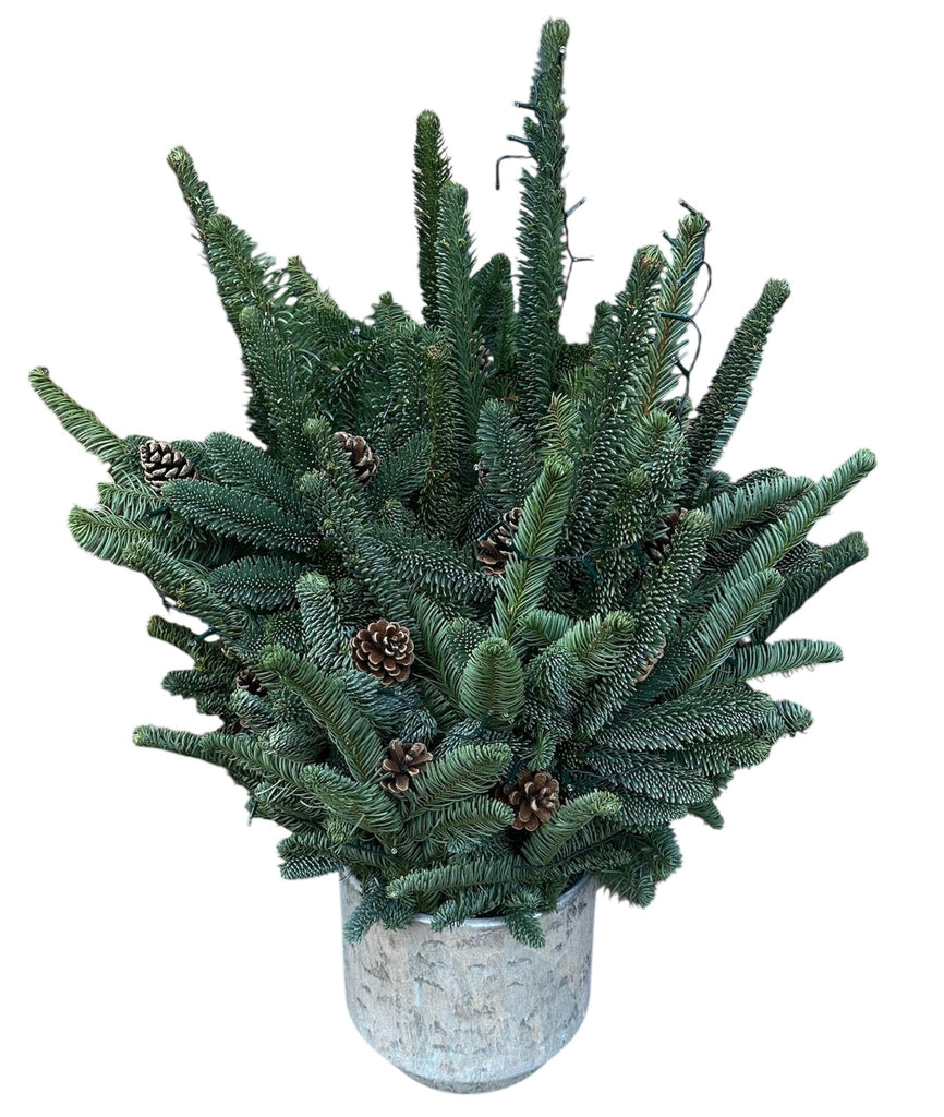 Designed with rich blue-green spruce branches, the foliage is artfully layered to form a natural, tree-like silhouette with varied heights and realistic texture. Small natural pinecones are tucked throughout the branches, adding an organic woodland touch.