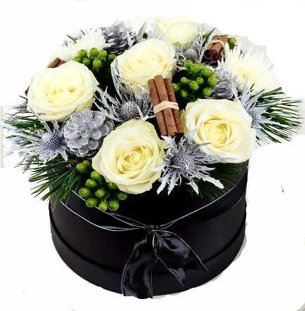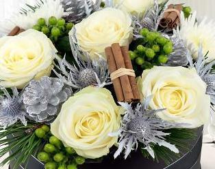 Stunning composition of white roses,chrysanthemum, green hypericum and blue eryngium with conifer and cones in a box. Unique way to send flowers by post.
