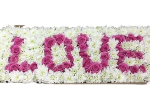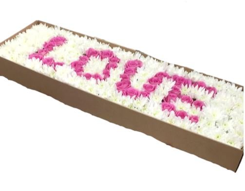 Introducing the Chrysanthemum and Roses Love Words Box – a truly unique and captivating way to send flowers by post. This stunning composition features the word "LOVE" beautifully crafted from vibrant chrysanthemums and elegant roses.