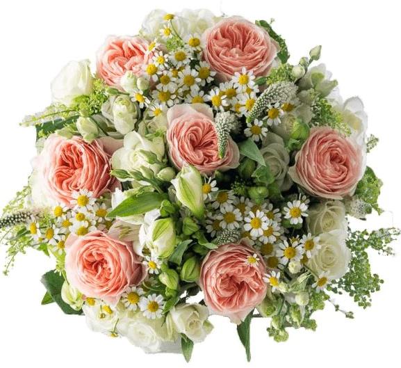 - White Alstroemeria: these delicate white blooms add a touch of refinement and elegance to the arrangement, beautifully complementing the peach roses.