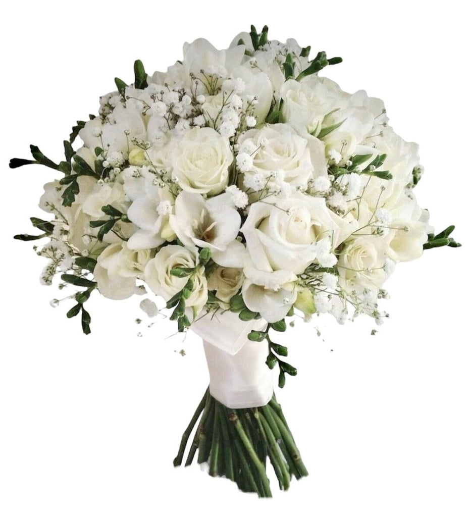 Embrace the pure elegance of our Classic White Bridal Bouquet. This timeless arrangement features a stunning blend of delicate freesia, lush roses, charming spray roses, and airy gypsophila flowers. Each flower is meticulously selected to create a harmonious and breathtaking bouquet.