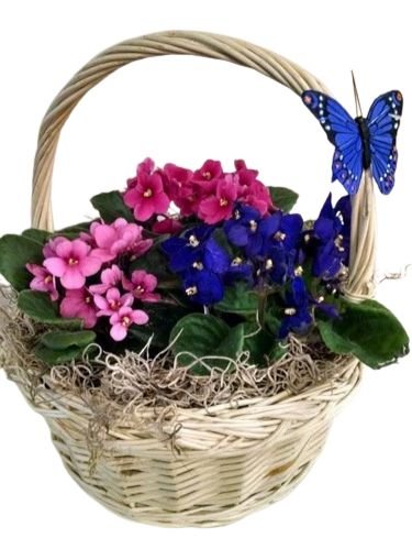 Bring a burst of color and delicate beauty into any space with our Colored Saintpaulia Basket Arrangement. Featuring vibrant African Violets (Saintpaulia) carefully arranged in a decorative basket and accented with a charming butterfly pick, this living arrangement is a thoughtful and long-lasting gift for any occasion.