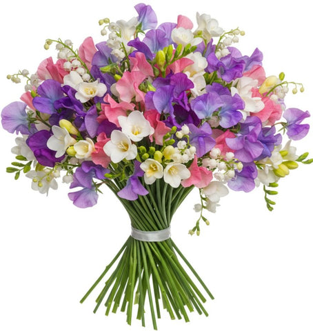 Delight in the elegance and fragrance of the Colorful Sweet Pea and Freesias with Lily of the Valley Bouquet. This graceful arrangement combines delicate blooms and fresh greenery to create a timeless bouquet full of charm and freshness. Perfect for special occasions or as a heartfelt gift, it’s a bouquet that radiates beauty and sophistication. Celebrate beauty, fragrance blooms, and joy with the Colorful Sweet Pea and Freesias with Lily of the Valley Bouquet, a truly enchanting floral gift. Whether to express thanks, congratulations, or affection, this bouquet delivers a heartfelt message.