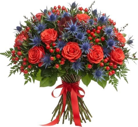 A stunning choice for autumn and winter arrangements with its balance of warm and cool tones. Great for weddings, receptions, or special gatherings that call for statement floral arrangements. A unique alternative to classic red roses, perfect for expressing admiration and love in a fresh, modern way. The Coral Symphony with Blue Bouquet is more than a floral arrangement — it’s a celebration of color harmony. The warmth of coral roses, the richness of hypericum berries, and the cool sophistication of blue eryngium come together to create a bouquet that feels joyful, artistic, and unforgettable.